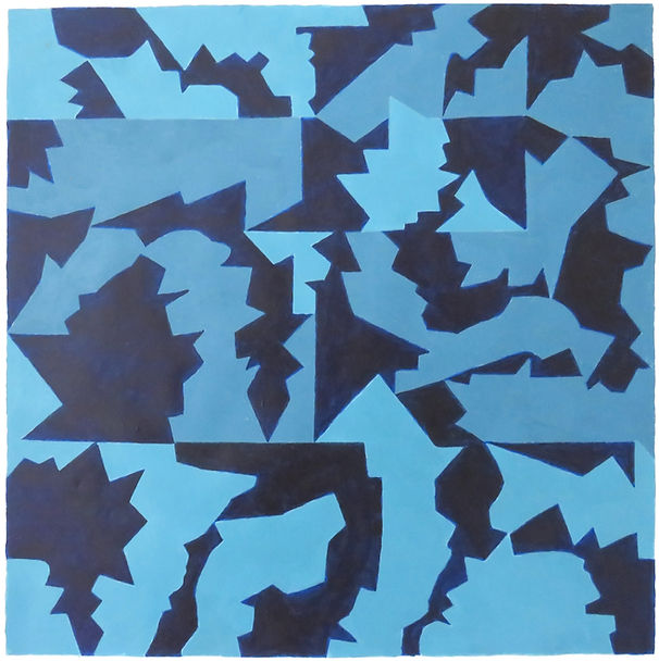 This painting was recently honoured with the Homiens Art Prize for spring 2025. This is the fourth iteration in my Everything At Once series and explores the dynamic interplay between space and colour, striving for a poetic intensity. I have attempted to create an image that flows, without dominant focal points or visual hierarchies. Three blues with narrow tonal values, carefully proportioned 50/25/25, create a harmonious, rhythmic composition which rewards repeated, slow contemplation. The graphic clarity and bold contrasts between the calming blues and the energetic forms, give it a dynamic edge. Dimensions of the whole piece, including frame, are 63 x 64.5 centimetres. Below is a picture of the artwork without the frame. There are also limited edition prints of this work available to buy.