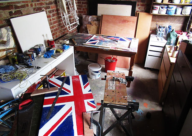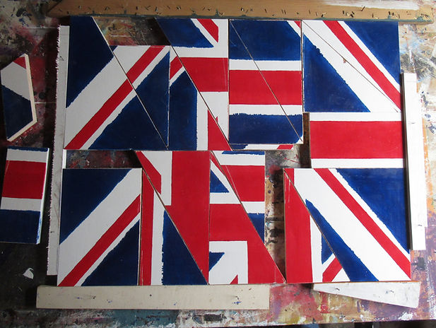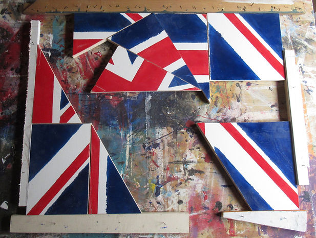 Two years later I revisited the idea to produce a more considered, substantial work. Below are pictures from my workshop in July 2021. The work was executed from a painting in gloss paints on a single piece of plyboard, which was then cut up and rearranged to form the dynamic new composition. The bottom picture shows it hanging in my home in October 2025.